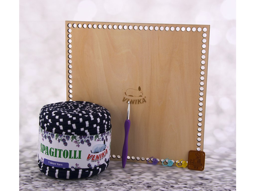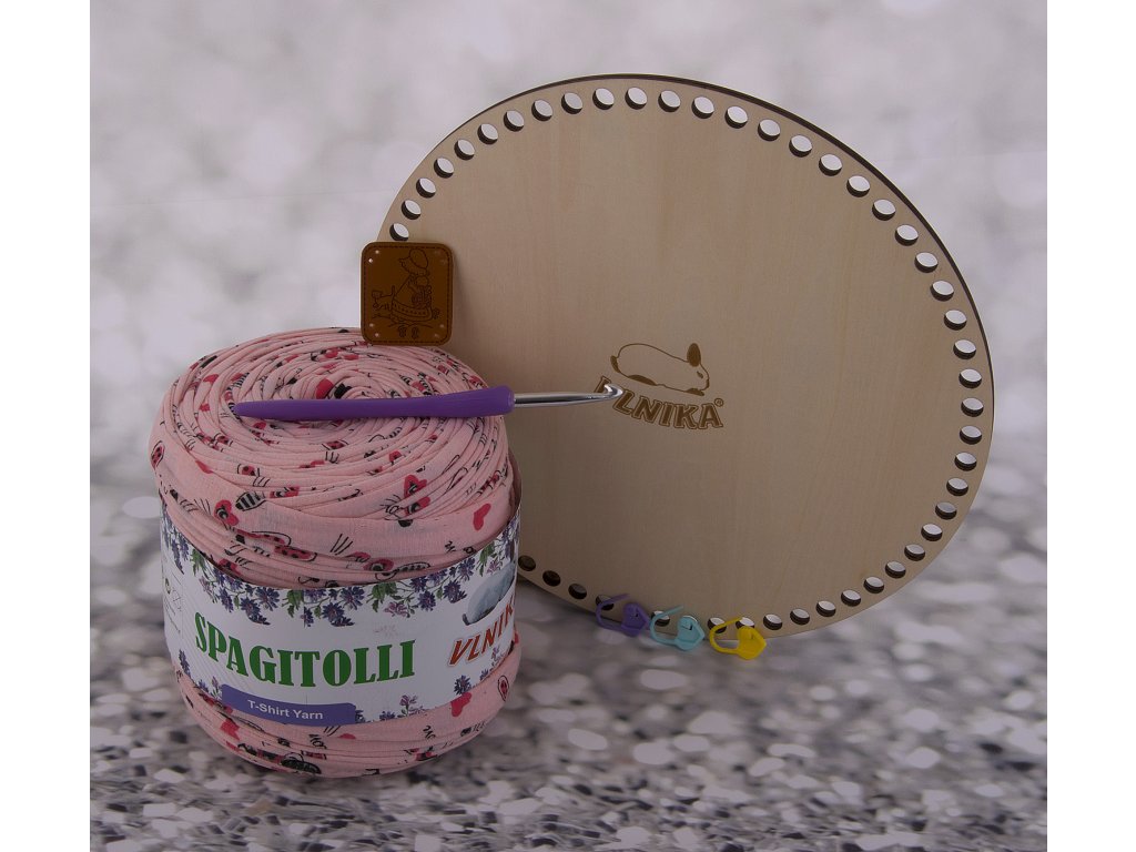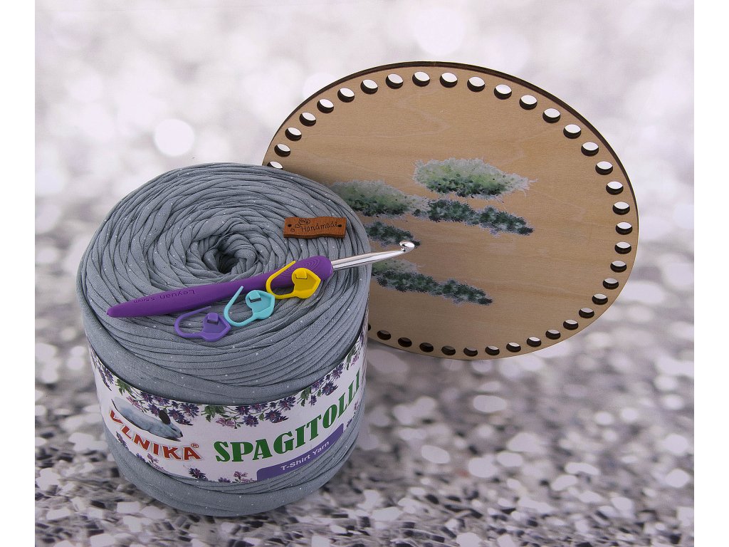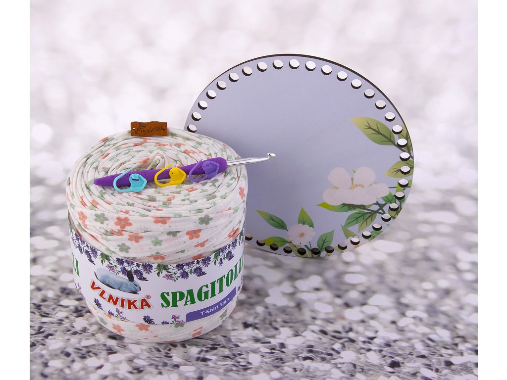 Set vhodný pre začiatočníkov obsahuje všetko čo potrebujete na výrobu košíka zo špagátovej priadze Spagitolli. Obsahuje: preglejkové dno, háčik veľkosti 5,5, klbko priadze SPAGITOLLI, 3 kusy pomocného zatváracieho špendlíka a ceduľku Handmade na ozdobenie Sadu je balená v plastovej transparentnej taške, ktorá je vhodná aj na opletenie. S týmto setom jednoducho uháčikujete košík podľa vašich predstáv. Vhodné aj ako darček pre tvorivé ruky.
