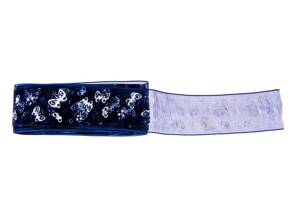 Monofilová stuha modrá s bielymi motýle. Šírka 25 mm. V balení je 250 cm.Dodatočné parametre